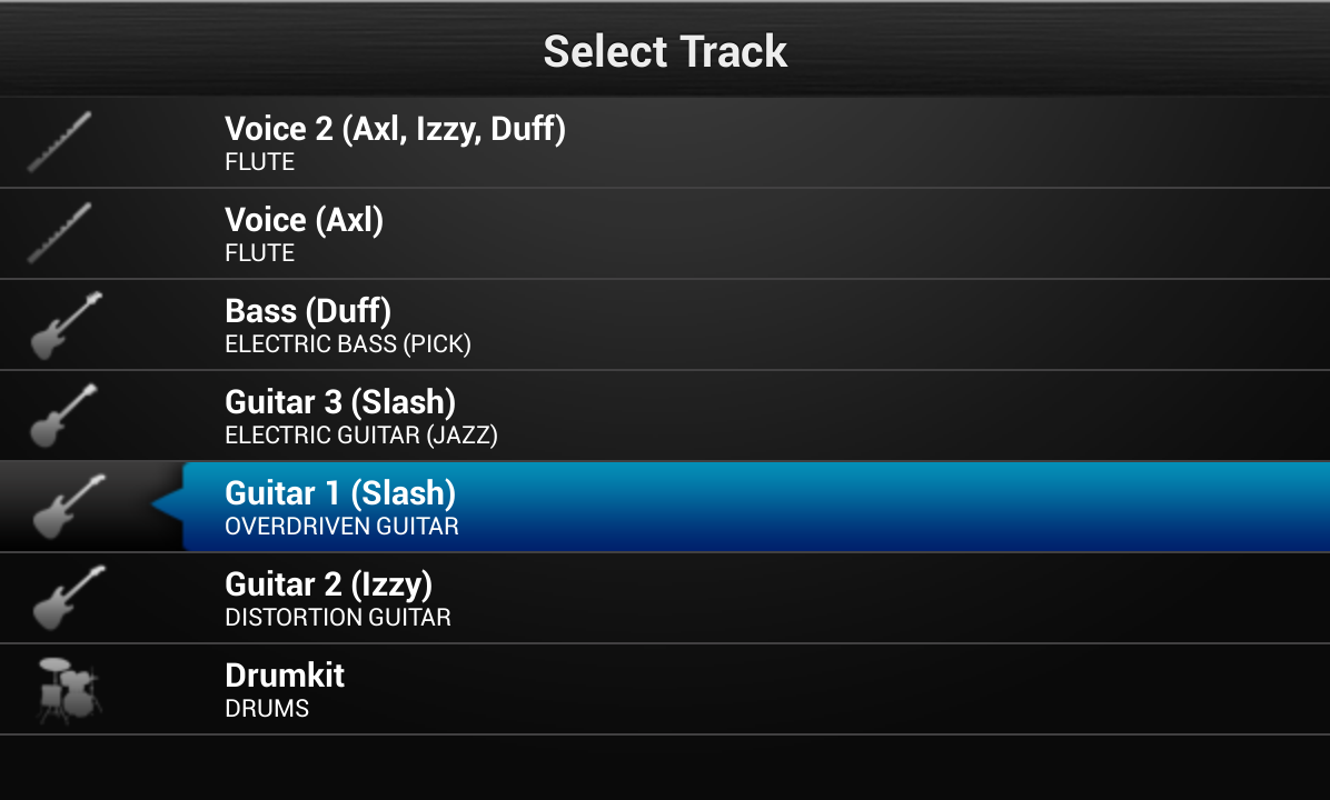 Multiple Instruments. Most songs have tabs for individual instruments (guitar, bass, drums, vocal, etc). Tap instrument icon in the top right corner to learn part of your instrument.